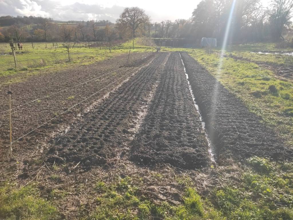 La photo ci-contre montre la préparation d’une culture d’ails en fin d’année 2023 où la réalisation de tranchés creusées à la main permet de mener à bien cette culture sans risquer une stagnation de l’eau qui serait potentiellement fatale pour la culture.