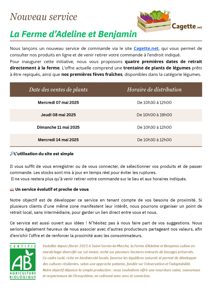 La vente de plants se déroule principalement entre le 23 avril et le 24 mai sur la ferme et les foires locales